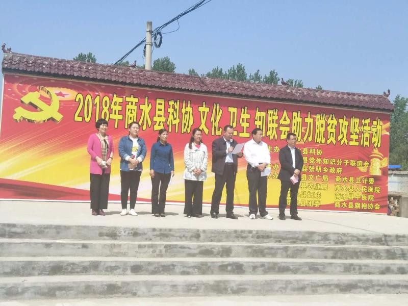 4月27日上午,商水县知联会联合科协等单位助力脱贫攻坚活动在张明乡老门潭村文化广场举行。现场通过专家授课、文艺表演、咨询宣传、现场义诊、免费赠药等多种方式为农民群众提供服务,受到了当地农民的热烈欢迎。