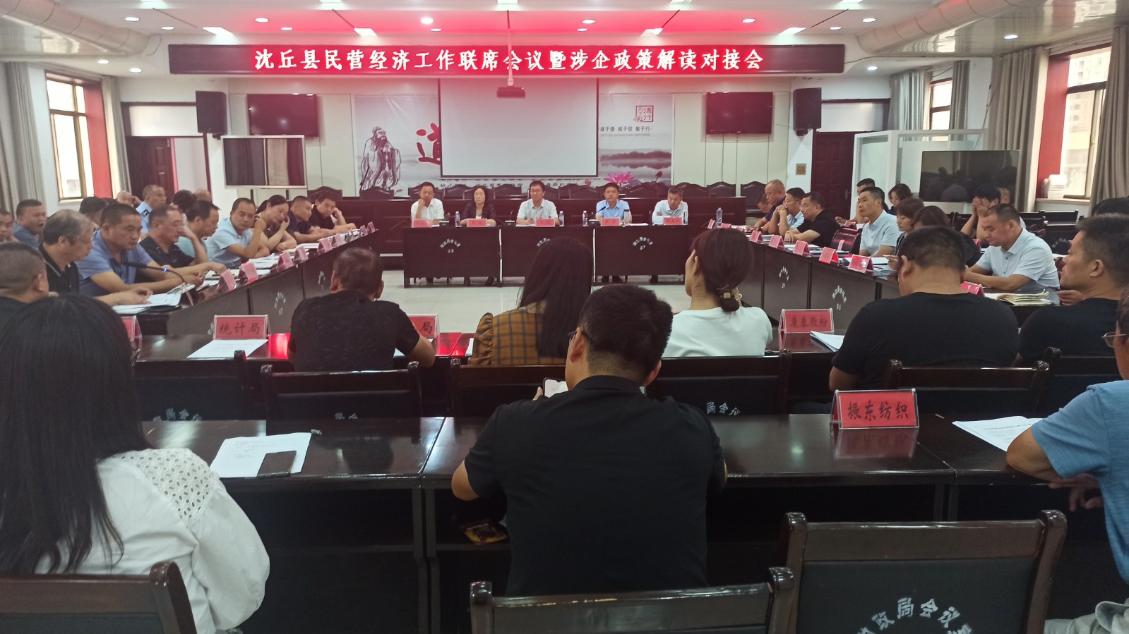 近日,沈丘县召开民营经济工作联席会议暨涉企政策解读对接会。县委常委、统战部长赵振,副县长张勇,县政协副主席、工商联主席张瑛出席会议。县民营经济工作联席会议成员单位和部分企业负责人参加会议。